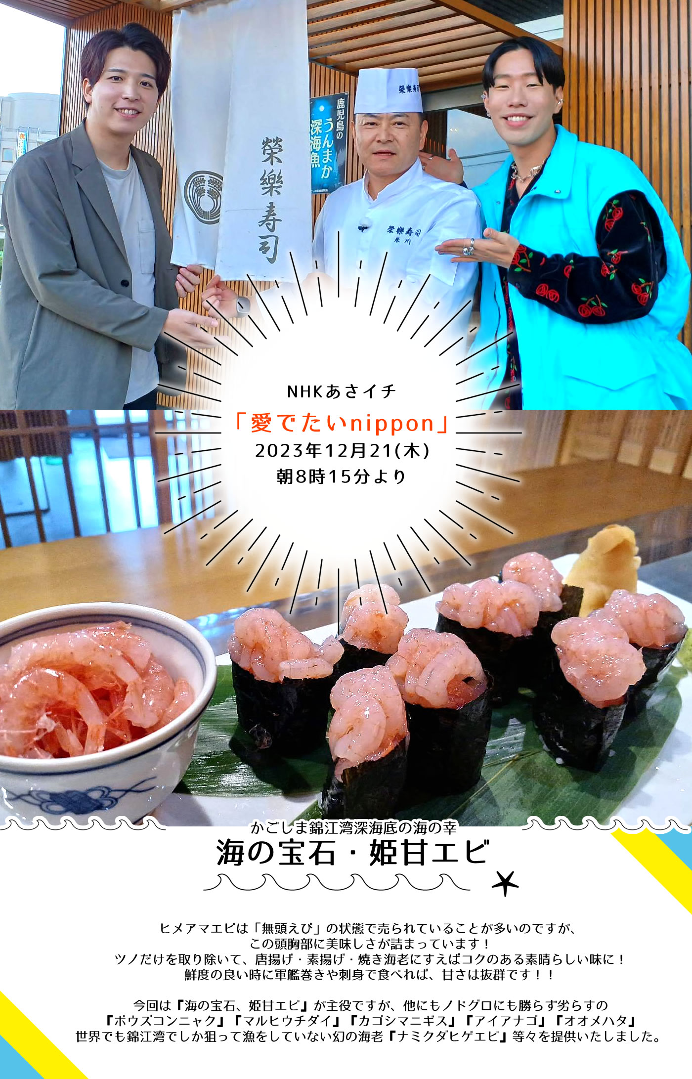 愛でたいnipponで放送されます – 鹿屋市で美味しいヒメアマエビ寿司